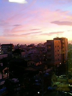 楽屋の窓から撮影した夕焼け空の写真を添付します。飛んでみたくなるようなキレイな夕焼けの空ですね〜!(^^)!
